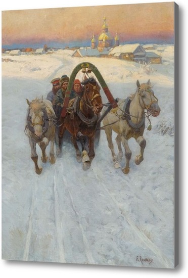 Репродукция картины "Сани, запряженные лошадьми в снегу"