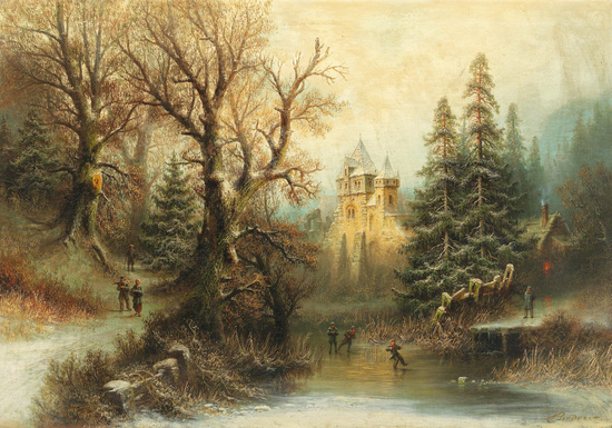Репродукция картины "Романтический зимний пейзаж с фигурными коньками у замка"