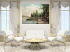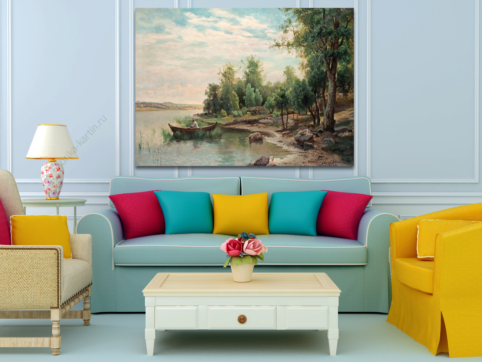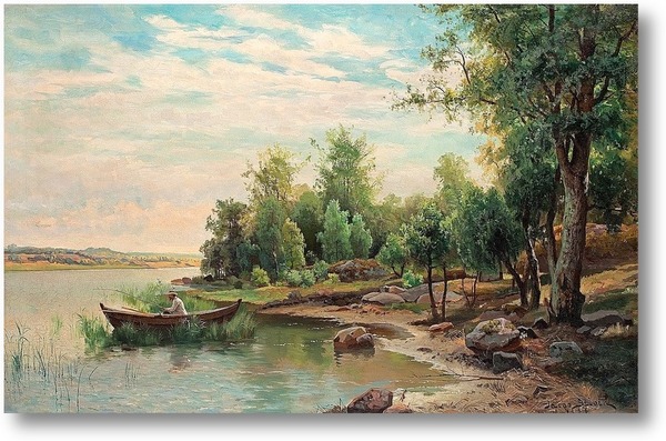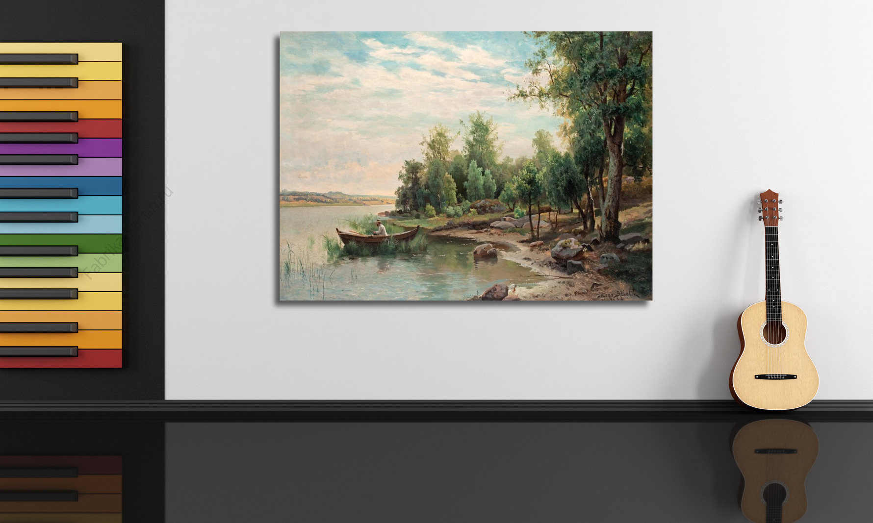 Репродукция картины "Вид на озеро с рыбалкой человека в лодке."