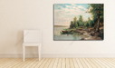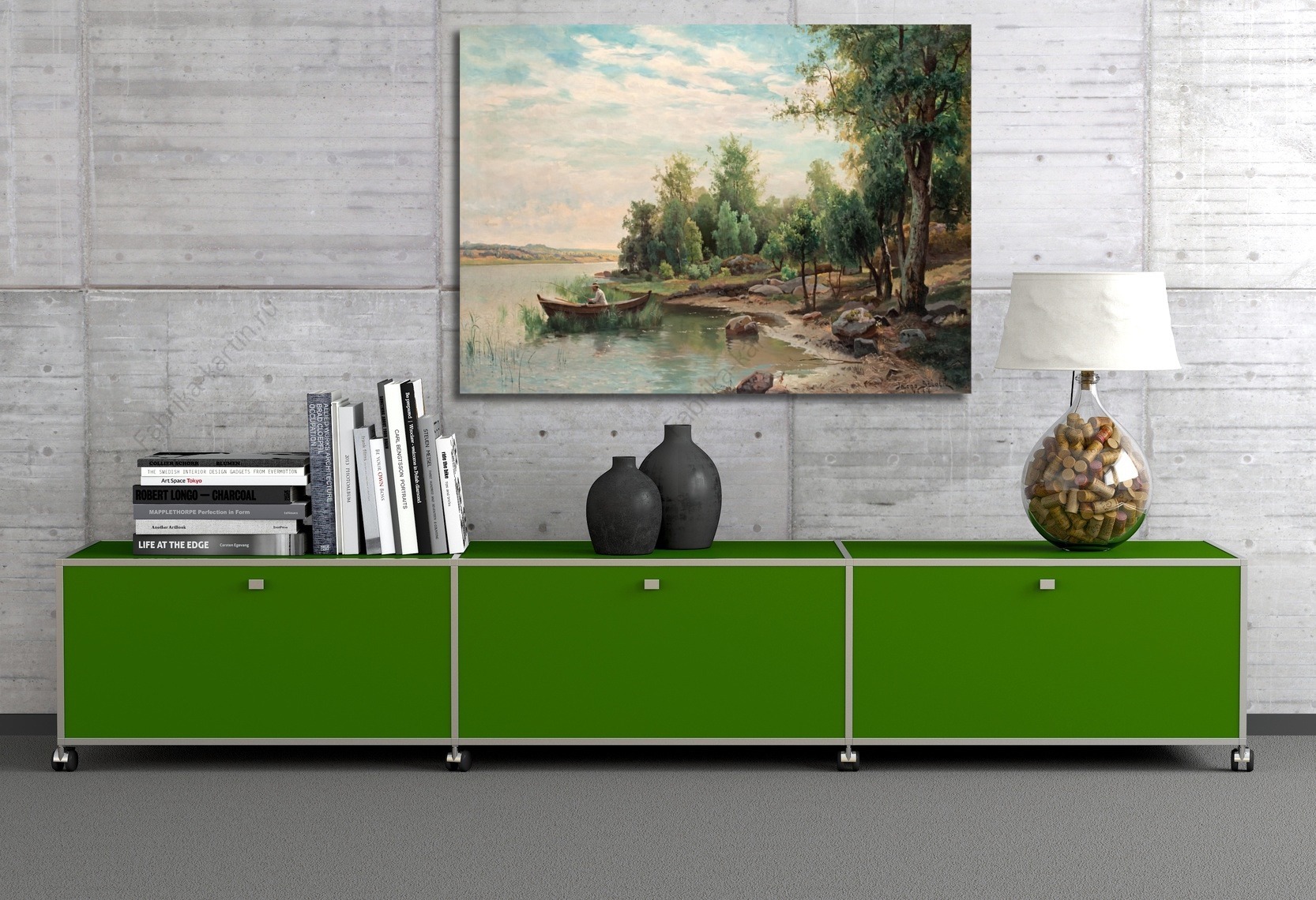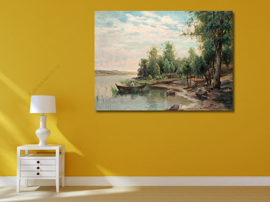 Репродукция картины "Вид на озеро с рыбаком в лодке"