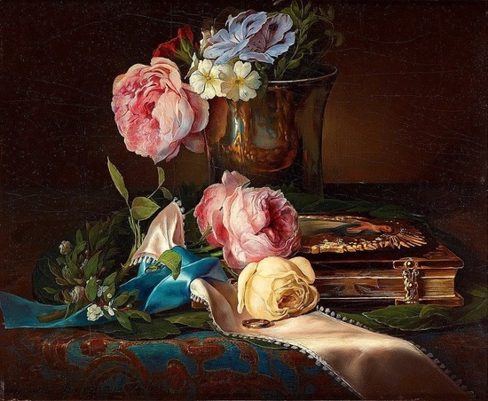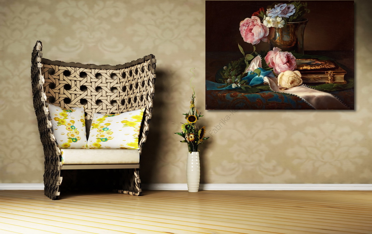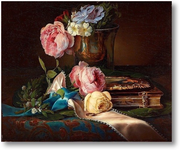 Репродукция картины "тюрморт с розами, обручальноым кольцом и серебряный кубо"